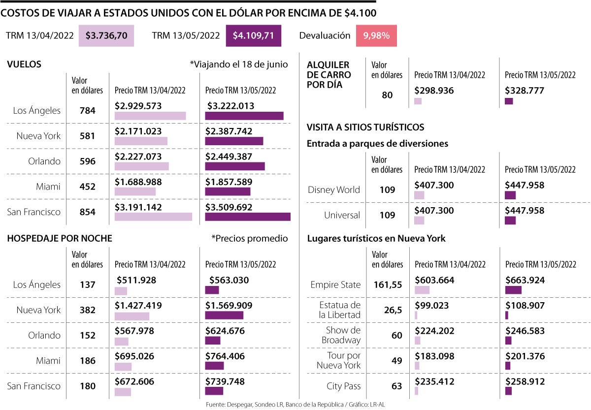 El primer gasto a tener en cuenta es el de tiquetes, rubro que ha subido por cuenta del alza de la divisa. En caso de volar a un destino como Los Ángeles en las vacaciones de junio, podrá encontrar tiquetes que rondan los US$784. Haciendo las cuentas en moneda local, hace un mes le habría costado $2,92 millones y hoy, $3,22 millones.