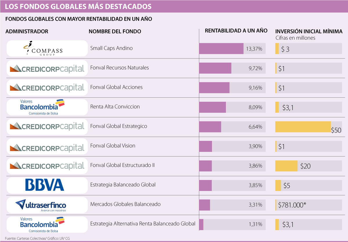 El fondo global Small Caps Andino de Compass Group, que presenta el mejor rendimiento en un año, tiene como mínimo de inversión $3 millones; este, por ejemplo, cuenta con activos en los mercados públicos de capitales de Chile, Colombia y Perú; dando cuenta de la diversificación, por clase de activo, moneda, país, etc., con la que deben contar estos fondos “con el fin de mitigar riesgos de los diferentes mercados”, según señaló Marín.