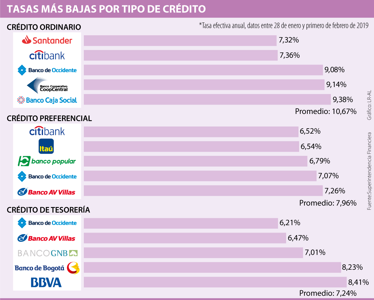 El producto lo ofrecen 24 de los 25 bancos registrados en la Superfinanciera con una tasa efectiva anual promedio de 10,67%. Las entidades que brindan una menor tasa son el Banco Santander, con 7,32%, Citibank, con 7,36% y Banco de Occidente, con 9,08%. De este total, 18 bancos ofrecen tasas mayores a 10% y en algunos casos superiores a 20%. Esto se da porque son especializados en solicitantes de alto riesgo; como Bancamía (28,74%), Banco W (24,97%) y Mundo Mujer (22,69%).