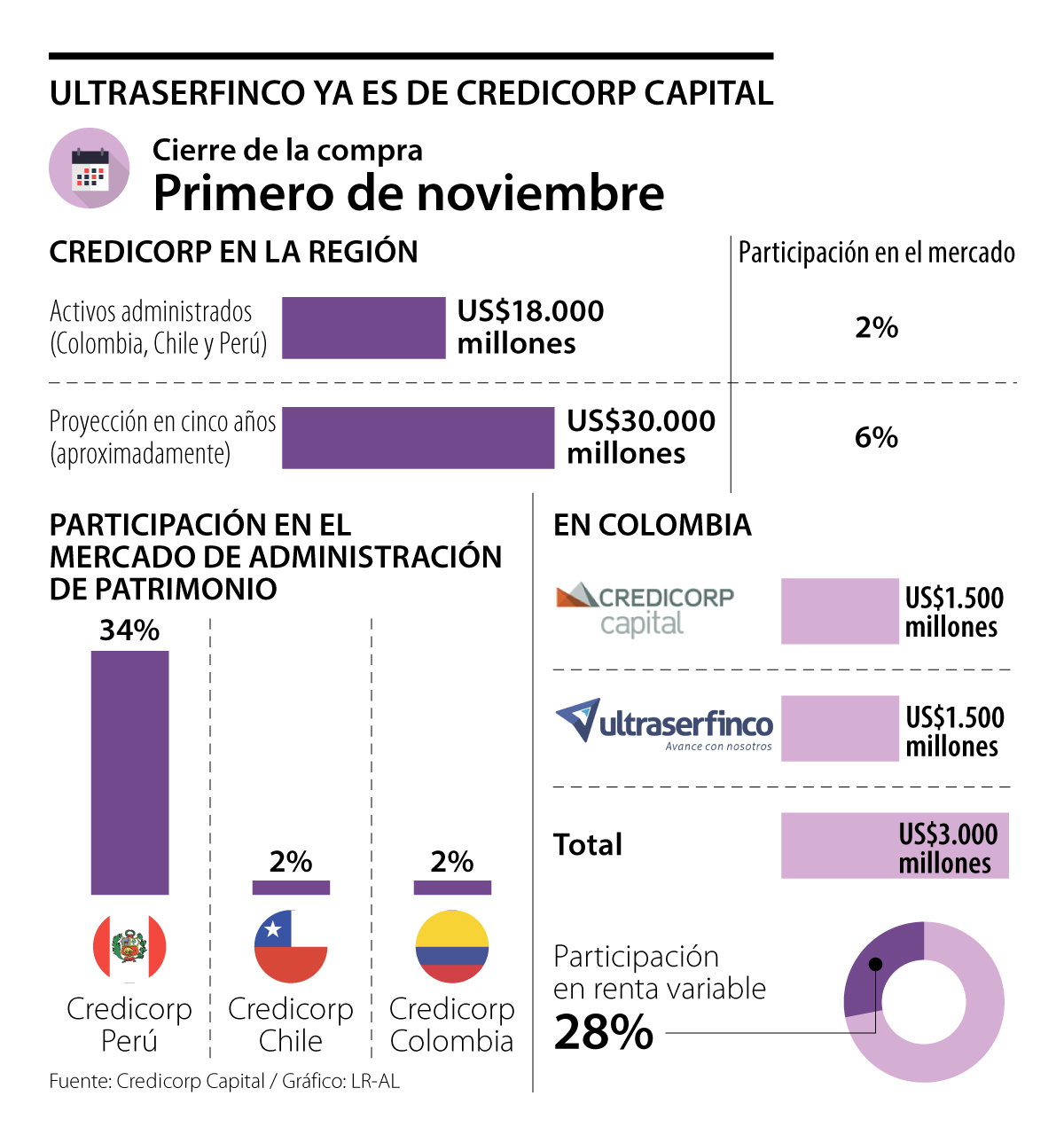 Con el cierre de la compra de 100% de las acciones de Ultraserfinco por Credicorp Capital el primer día de este mes, la firma prevé aumentar su administración de activos y patrimonio de clientes a cerca de US$3.000 millones, cifra que corresponde a 2% de participación en el mercado local de manejo de patrimonios.