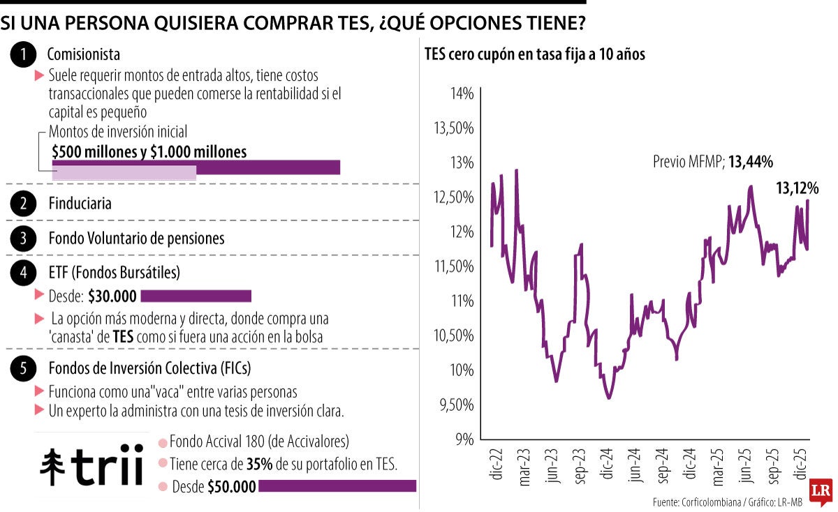 La experta agregó que existe una alternativa más accesible para los inversionistas individuales. “Otra opción es el ETF de TES que lanzó el Gobierno Nacional hace un par de años, el cual invierte de manera agregada sobre la curva de TES. A los niveles actuales, este vehículo debería estar ofreciendo una rentabilidad cercana a 12,5%, de acuerdo con la curva vigente, y permite invertir con montos mínimos desde $100.000”, explicó.