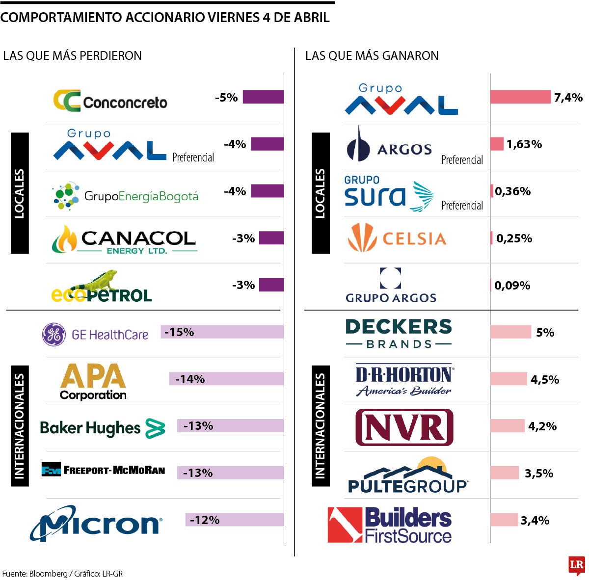Otras de las acciones que se unen a la caída bursátil generalizada en el mercado local fueron Conconcreto, liderando en pérdidas con -5,53%, cerrando en $444. Le siguió la PF de Grupo Aval, que cayó 4,75%, llegando a los $542.