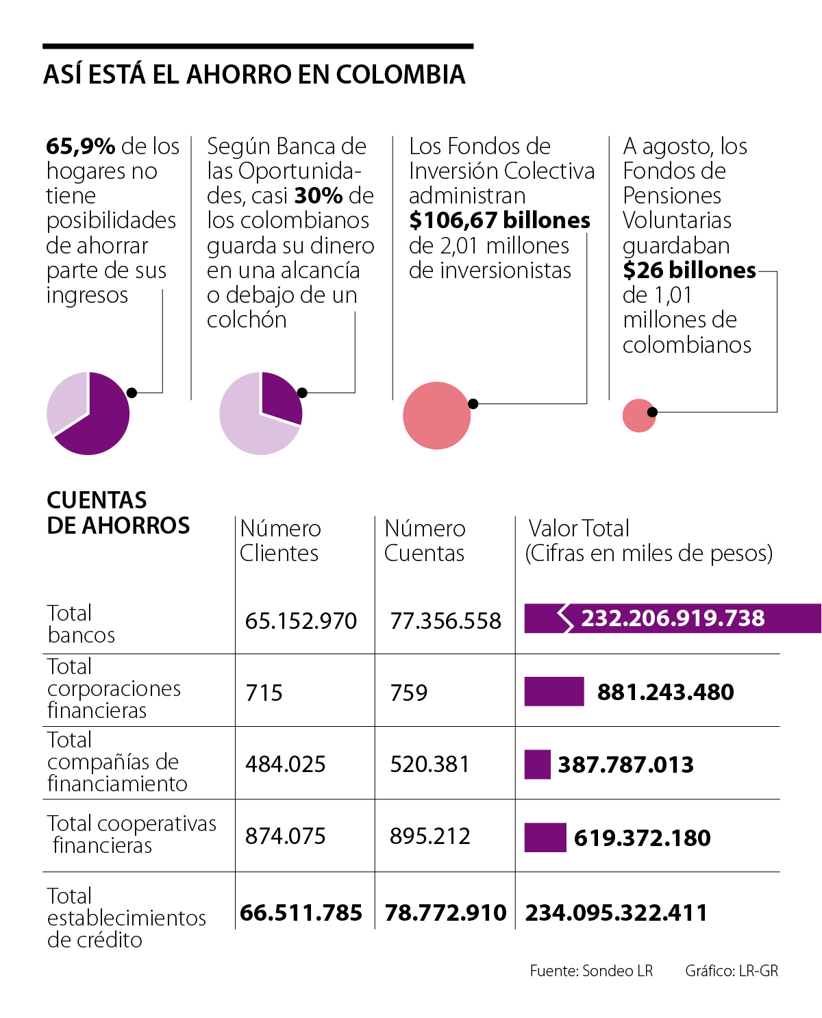 Casi 30% de los colombianos guarda su dinero debajo de un colchón o en una alcancía en su casa. Sin embargo, los bancos han lanzado opciones para dejar esto en el pasado. Por ejemplo, el Banco de Bogotá lanzó un servicio este año que se abre de forma digital en las cuentas de ahorro. Por otro lado, el Banco Caja Social lanzó una herramienta para que el ahorro sirva como respaldo para tener vida crediticia.