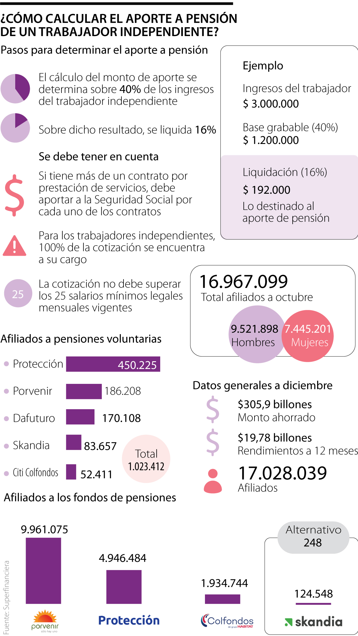 Más allá de los 1,5 millones de independientes que tiene el sistema, no hay que dejar de lado que hay más de 17 millones de afiliados a los fondos de pensiones obligatorios, quienes disfrutan de los beneficios señalados por Botero. A su vez, hay 1,02 millones de usuarios registrados en los fondos de pensiones voluntaria, según datos al cierre de octubre.