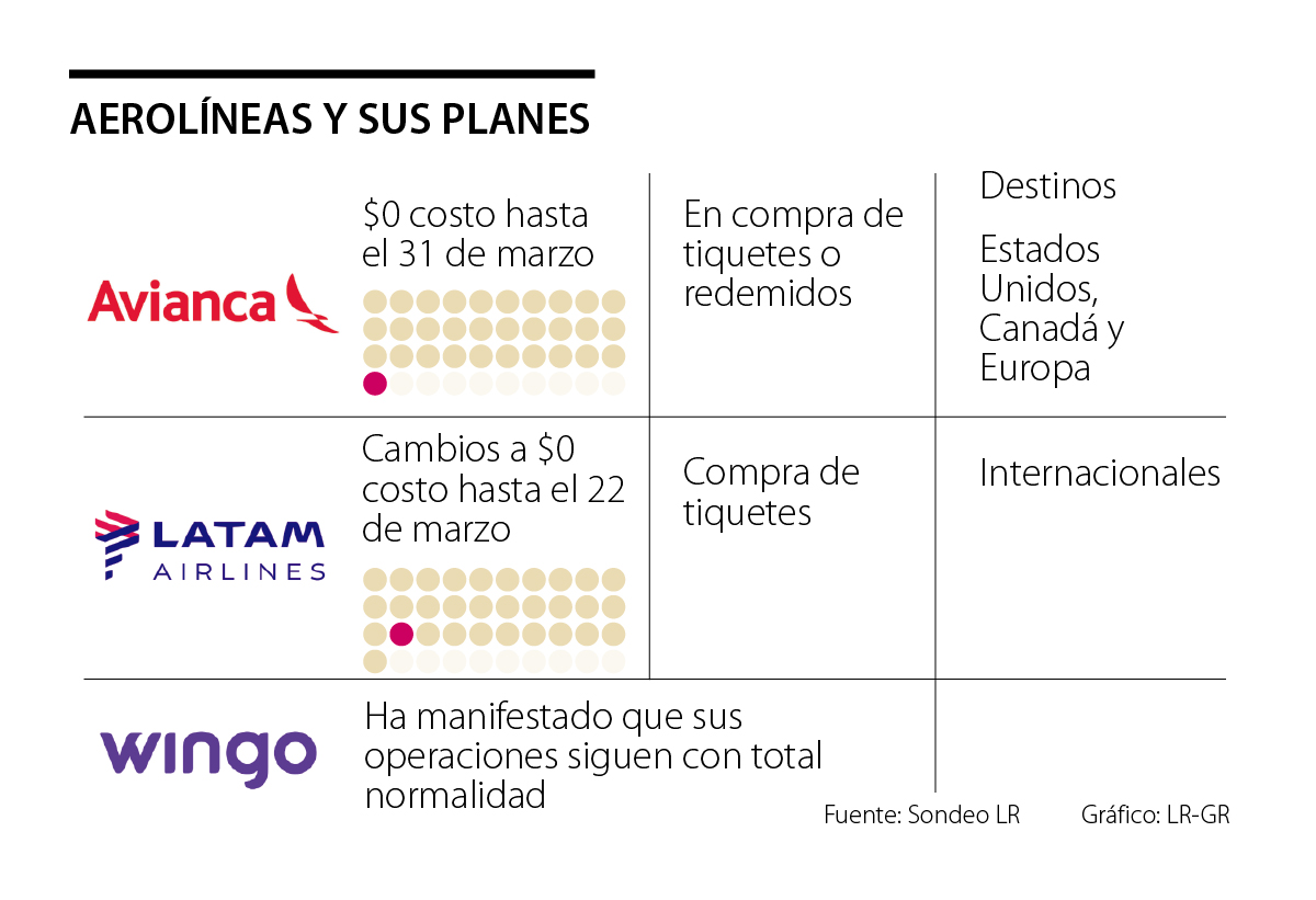 Para aquellos que quieran reprogramar vuelos a Europa, Estados Unidos y Canadá, por el brote del Covid-19, aerolíneas como Avianca y Latam han anunciado que los usuarios podrán cambiar el itinerario de sus vuelos sin ningún costo, siempre y cuando se realice bajo las fechas que han establecido. Si usted tiene un viaje programado a los destinos donde hay presencia del brote, consulte los cambios posibles. (JML)