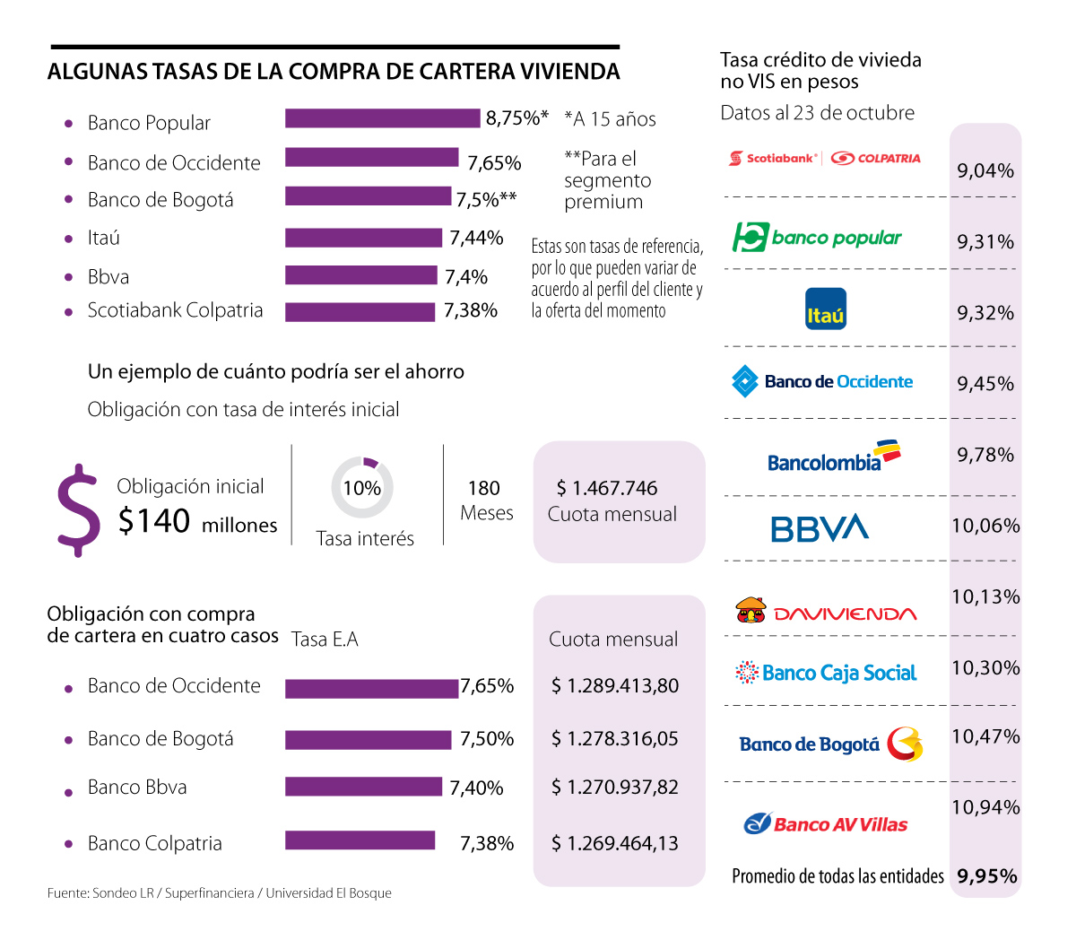Debido al atractivo que podría tener esta posibilidad, LR llevó a cabo un sondeo entre algunos de los establecimientos de crédito sobre cuál es la tasa que ofrecen a la hora de comprar cartera hipotecaria y se encontró que Scotiabank Colpatria ofrece la tasa más baja, entre las entidades consultadas, con 7,38% efectivo anual (E.A.).