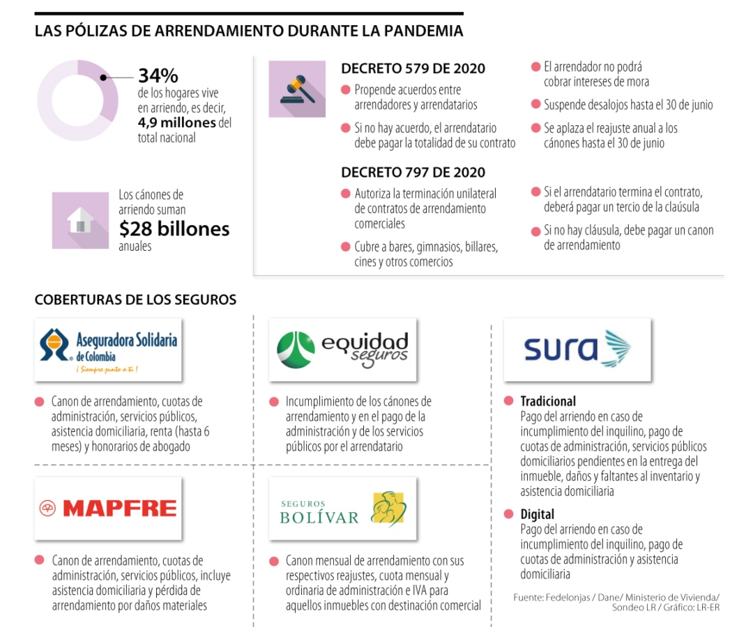 El subdirector de seguros generales y riesgos de Mapfre, Mauricio Malagón, señaló que aún durante la pandemia, la póliza de arrendamiento de la compañía cubre el incumplimiento en el pago de los cánones de arrendamiento y/o cuotas de administración ordinaria, pero aclaró que la cobertura a servicios públicos es aplicable cuando el inmueble es restituido al propietario.