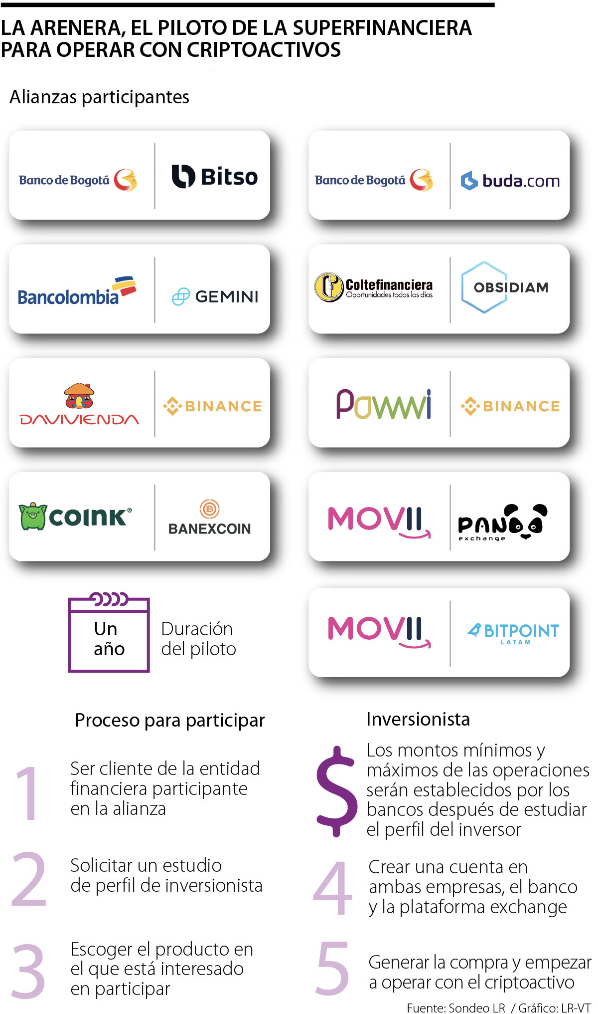 Por este motivo, la Superintendencia Financiera de Colombia (SFC) destinó su espacio de laArena, para un piloto en el que participan nueve alianzas (ver gráfico) que están conformadas por una entidad financiera vigilada por el ente de control y una plataforma de intercambio de criptoactivos o exchange.