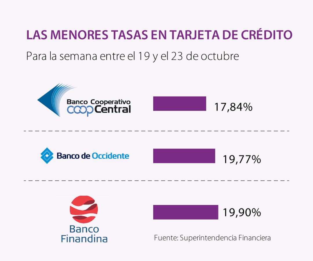 De acuerdo con los cobros de las tarjetas de crédito correspondientes a la semana del 19 al 23 de octubre, que es la información de tasas más reciente en la Superfinanciera, el banco con la tarjeta de crédito que maneja la menor tasa de interés es Coopcentral. “En tarjeta de crédito tomamos la decisión de reducir las tasas como medida de apoyo real a nuestros clientes de dicho producto. En nuestra promesa de valor debemos estar siempre entre los intereses y las cuotas de manejo más bajas del mercado”, dijo Jorge Andrés López, presidente de la entidad. Los siguientes plásticos con los intereses más bajos son Banco de Occidente y Finandina.
