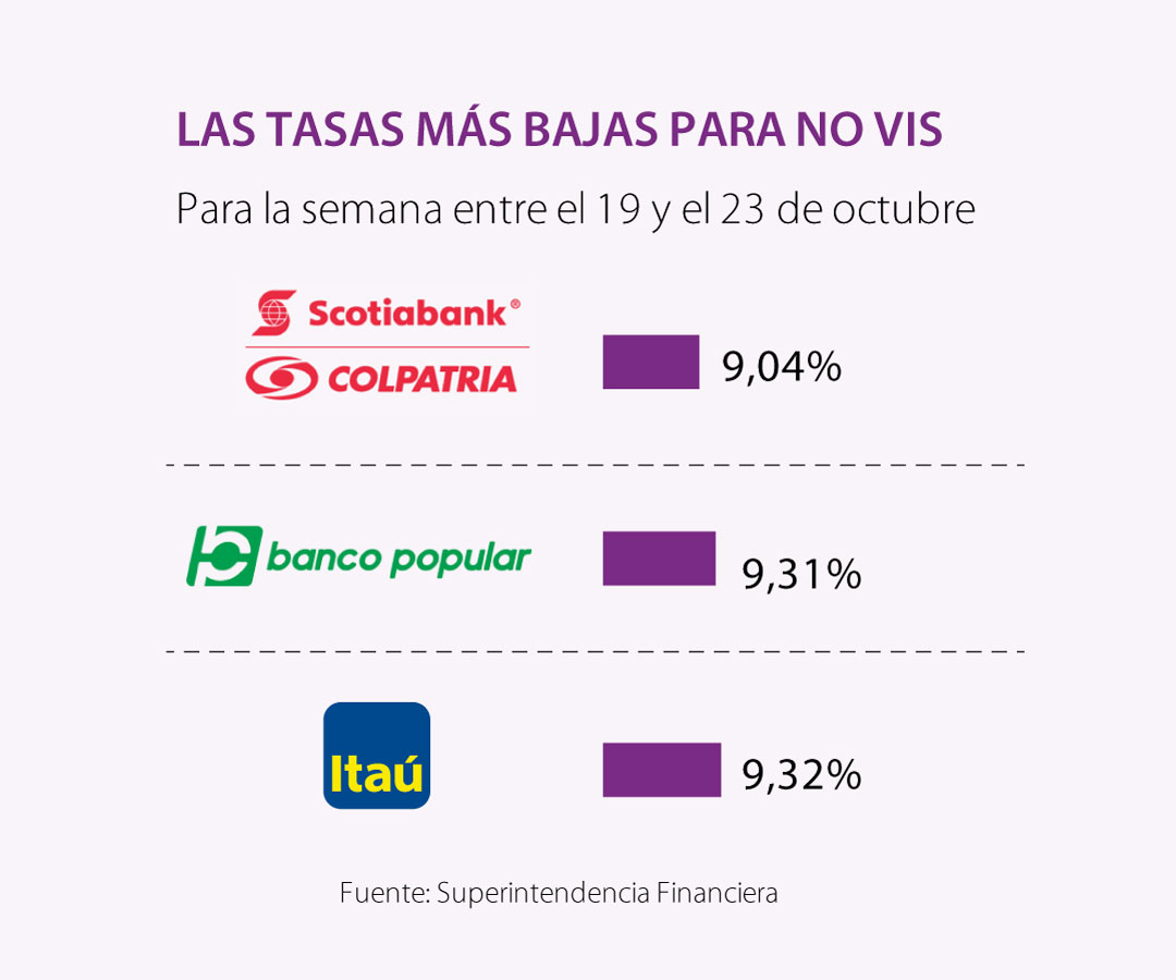 De acuerdo con las tasas reportadas a la Superfinanciera en la cuarta semana de octubre, Scotiabank Colpatria tiene la tasa para crédito de vivienda que no es de interés social más baja (9,04%). Le siguen Banco Popular (9,31%) e Itaú (9,32%). Para Hernando Osorio, vicepresidente de Banca Minorista de Itaú Colombia, “el actual es uno de los mejores momentos para comprar vivienda, pues las tasas han bajado y el Gobierno ha creado programas de subsidio con 200.000 nuevos cupos para vivienda no VIS”. El directivo señaló que, por estas medidas, espera que se incrementen los desembolsos de crédito hipotecario y leasing habitacional para el próximo año.