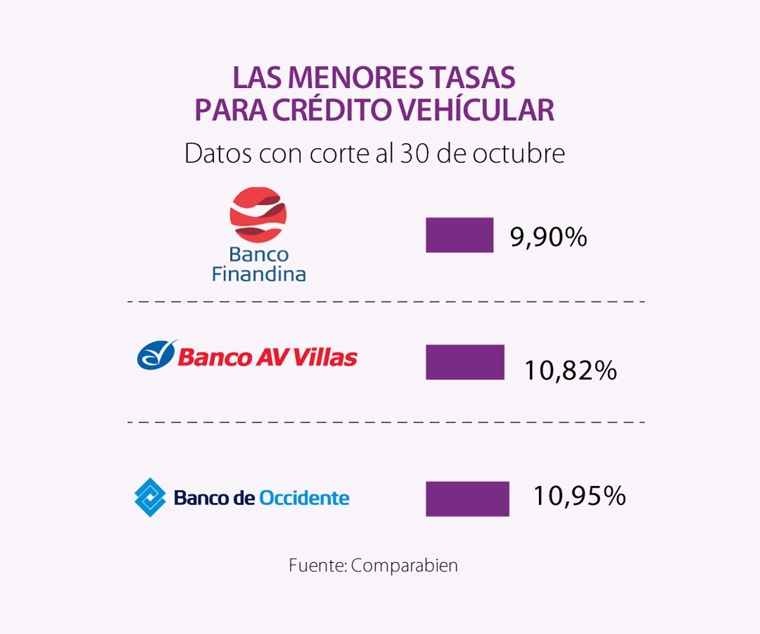 De acuerdo con la plataforma Comparabien, al 30 de octubre, Finandina es la entidad con la tasa más baja en el crédito para la compra de vehículo (9,90%). Orlando Forero, presidente de este banco, expresó que sus tasas competitivas son reflejo del recorte de tasas del Banco de la República, de ser una entidad especializada en vehículos y de que parte del proceso para solicitar este producto es virtual, lo que reduce costos. El directivo también indicó que se prevé que la comercialización de vehículos mejorará, pues ha habido una recuperación del sector desde que inició el aislamiento preventivo. AV Villas y Banco de Occidente son los siguientes en tasas bajas.