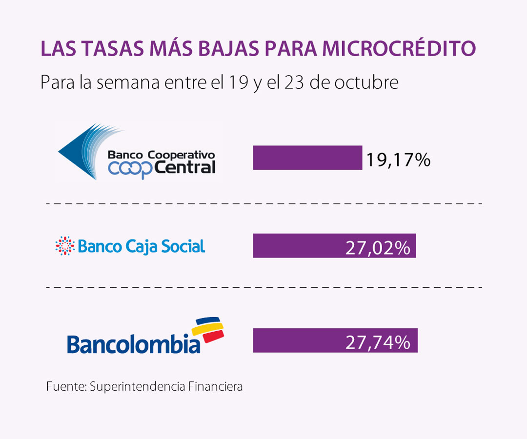 Si se desea emprender o expandir un negocio, se sugieren los microcréditos, porque tienen poca tramitología y su desembolso es rápido. Según las cifras de la Superfinanciera, Coopcentral es el banco que ofrece este crédito a menor costo, pues su tasa es de 19,17%. “Debemos aclarar que es un producto en proceso de desmonte, ya que nuestro banco es especializado en cartera comercial. La tasa es baja porque no utilizamos metodología micro crediticia que involucra costos adicionales de seguimiento, asistencia, recaudo y colocación”, dijo López. Los siguientes bancos con menores tasas son Banco Caja Social (27,02%) y Bancolombia (27,74%).