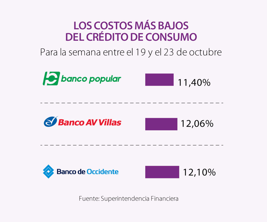 Entre el 19 y el 23 de octubre, Banco Popular fue la entidad financiera con la menor tasa de interés para el crédito de consumo, ya que esta se ubicó en 11,40%. Este tipo de crédito se suele solicitar para financiar compras de electrodomésticos, viajes y, en algunos casos, vehículos. Los otros dos bancos que conforman el top tres en tasas más bajas para el crédito de consumo son AV Villas (12,06%) y Banco de Occidente (12,10%), que al igual que Popular también son del Grupo Aval. Vale la pena mencionar que las entidades que están dirigidas a una población con ingresos bajos, suele ofrecer las tasas más altas en este segmento.