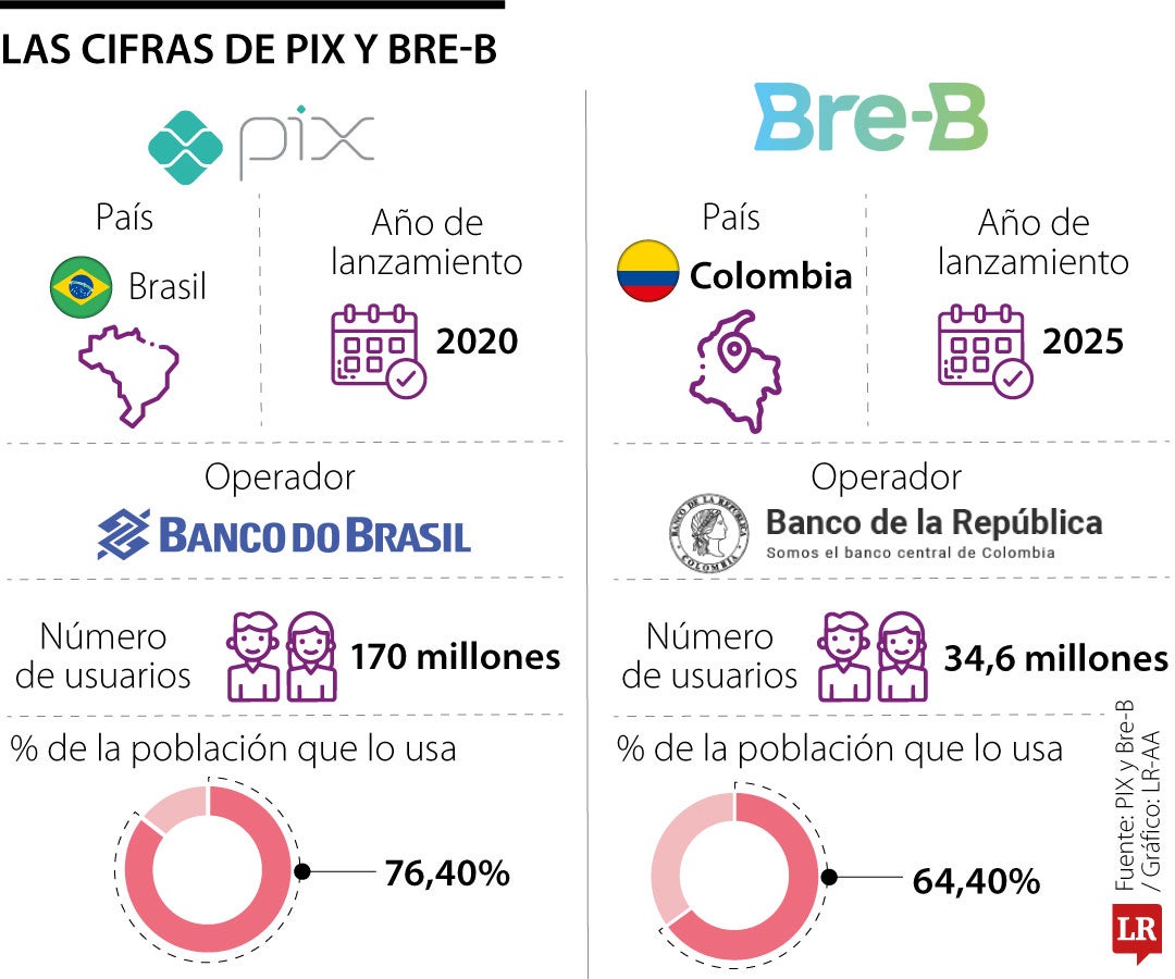 Al menos cinco años separan los lanzamientos de Pix en Brasil y Bre-B en Colombia. En un lustro, el sistema estuvo analizando cómo replicar el modelo que fue un éxito en el país brasilero y el 6 de octubre del año pasado lanzó su propio modelo interoperable. Mientras Pix es usado por 170 millones de personas, Bre-B tiene más de 34 millones de usuarios. A pesar de tener una filosofía parecida en cuanto a que los pagos y el envío de dinero son un bien público, hay diferencias marcadas.