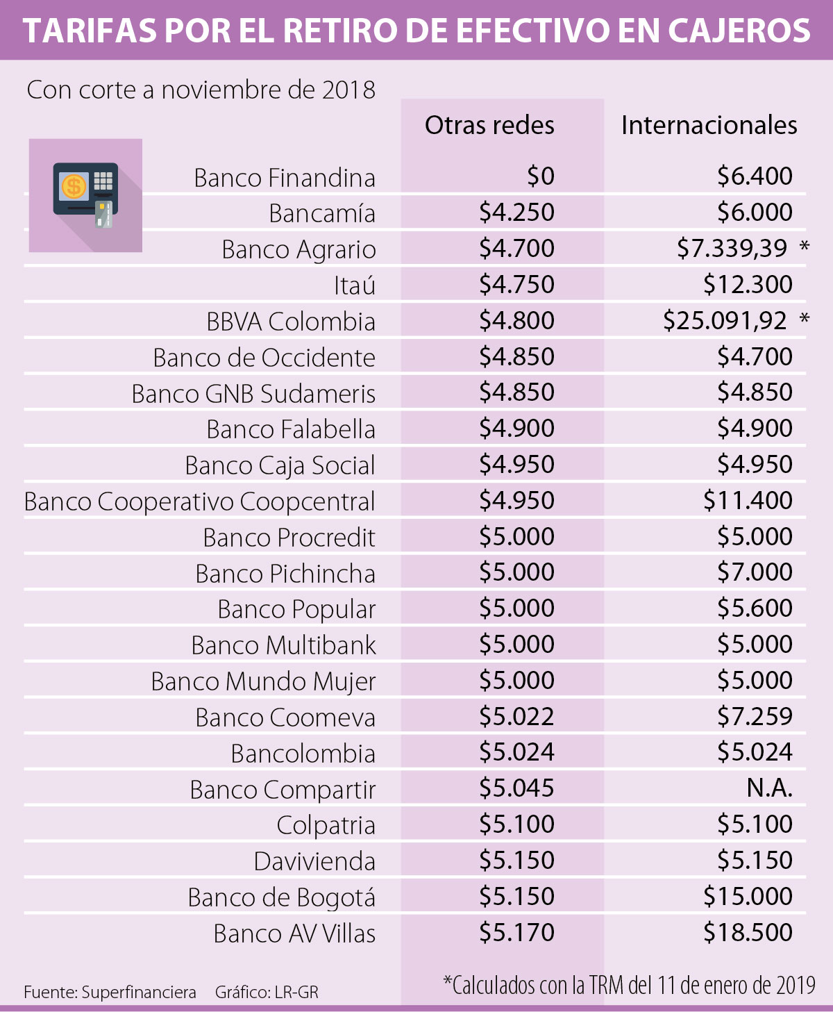 En cuanto a los retiros en cajeros internacionales, los que menos cobran son Banco de Occidente ($4.700), GNB Sudameris ($4.850) y Falabella ($4.900). En la otra acera, de los más costosos, están Itaú ($12.300), Banco de Bogotá ($15.000) y AV Villas ($18.500). Cabe mencionar que Bbva y Banco Agrario cobran por este servicio en dólares, así que la tarifa varía con la divisa. Con la TRM del viernes ($3.136,49), el monto del español es el más alto: $25.092.