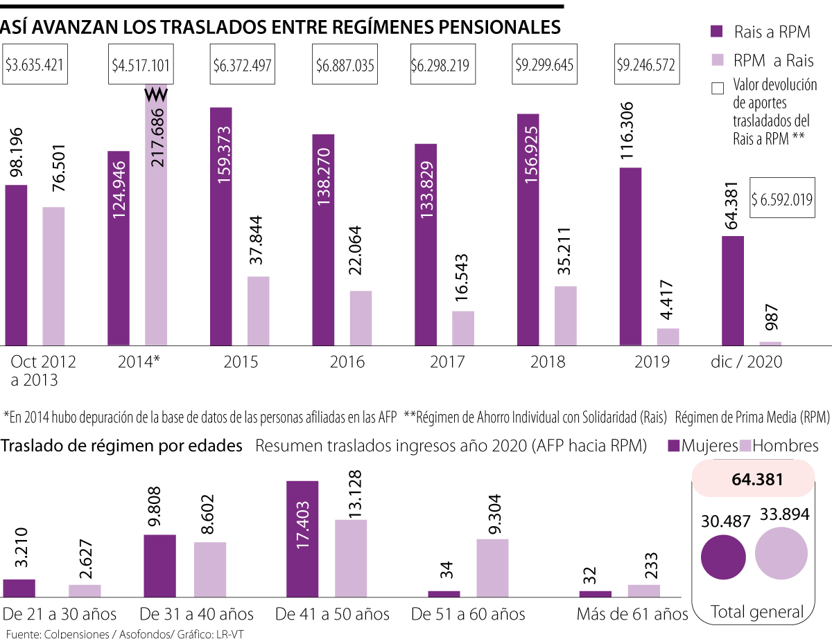 A pesar de que miles de personas pasaron sus ahorros del Rais al RPM en 2020, los traslados entre regímenes pensionales han caído durante los últimos años. En 2015, se registró el traslado de 159.373 usuarios del Rais al RPM (administrado por Colpensiones), mientras que se cambiaron 116.306 en 2019 y 64.381 el año pasado.