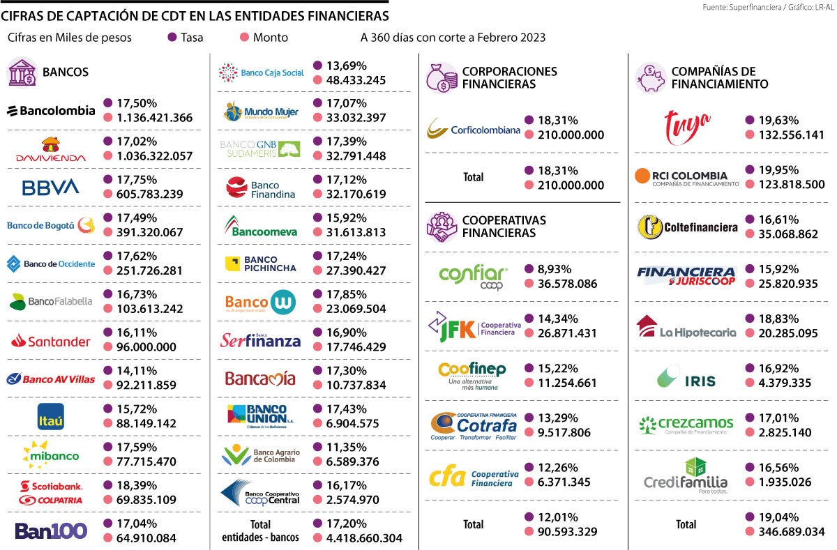 A este banco le sigue Davivienda, con $1,03 billones captados y tasa de 17,02%; Bbva con $605.783 millones, y tasa de 17,75%; Banco de Bogotá con $391.320 millones y tasa de 17,49%, y Banco de Occidente con $251.726 millones y tasa de 17,62%.