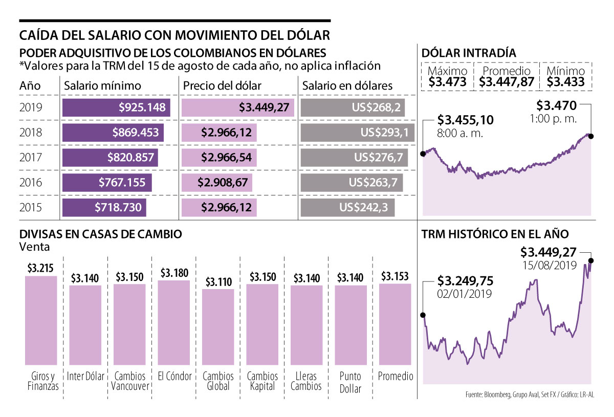 Este análisis surge de comparar el salario mínimo con el valor del dólar del 15 de agosto de cada año. Según esto, al usar la Tasa Representativa del jueves, la segunda más alta de la historia, el sueldo de los colombianos es de US$268,2.