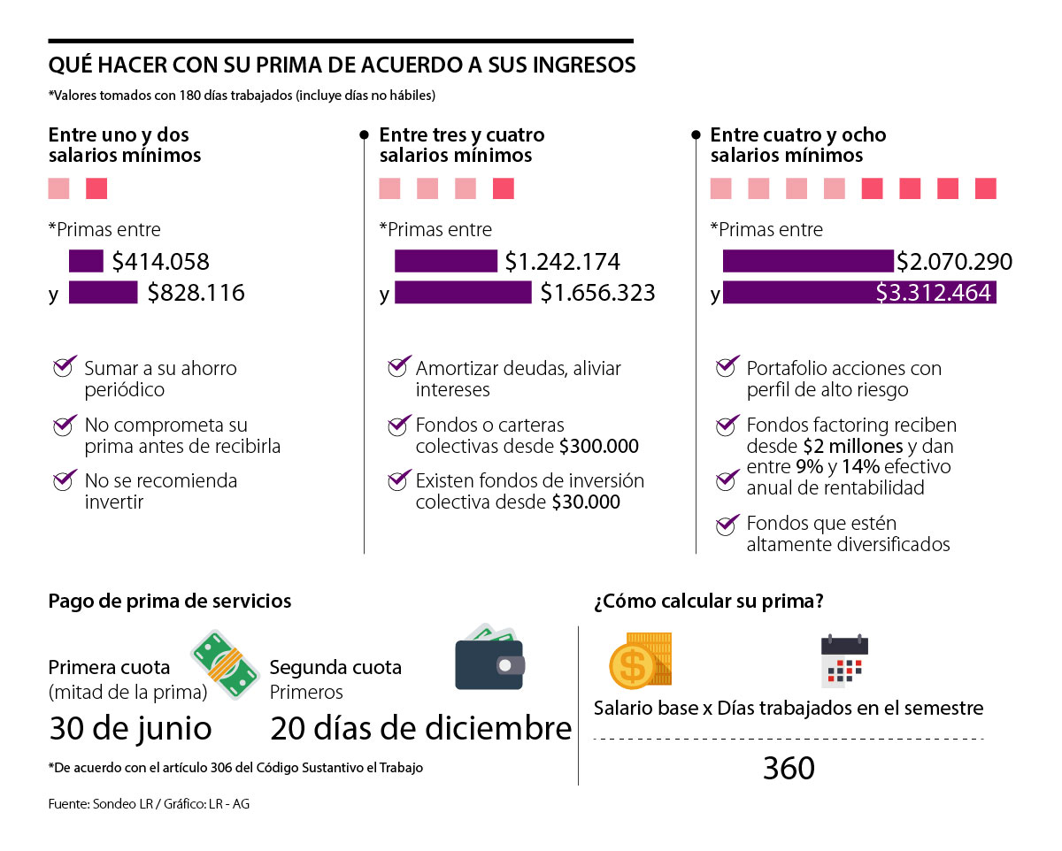 Aquellos que ganen entre cinco y ocho salarios mínimos (máximo para la prima), recibirán primas desde $2,07 millones a $3,31 millones. Los analistas recomiendan construir un portafolio diversificado fuerte en acciones que permita estar expuesto a un mayor riesgo. En este proceso será clave su edad para definir los horizontes.