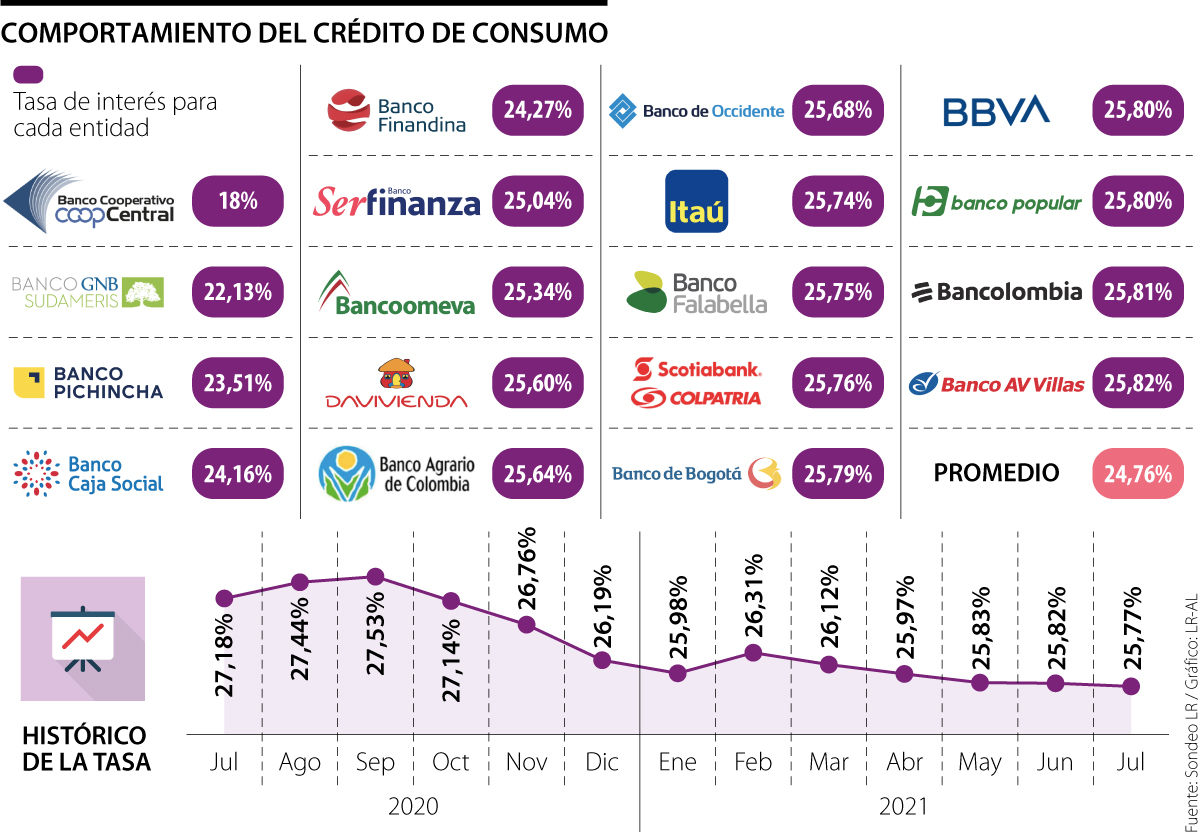 Entre las entidades que tienen las tasas más bajas para créditos de consumo se encuentran el Banco Coopcentral, que ofrece este tipo de producto con 18% de interés efectivo anual; seguido por GNB Sudameris, con 22,13%; Banco Pichincha (23,51%); Banco Caja Social (24,16%); y Banco Finandina (24,27%).