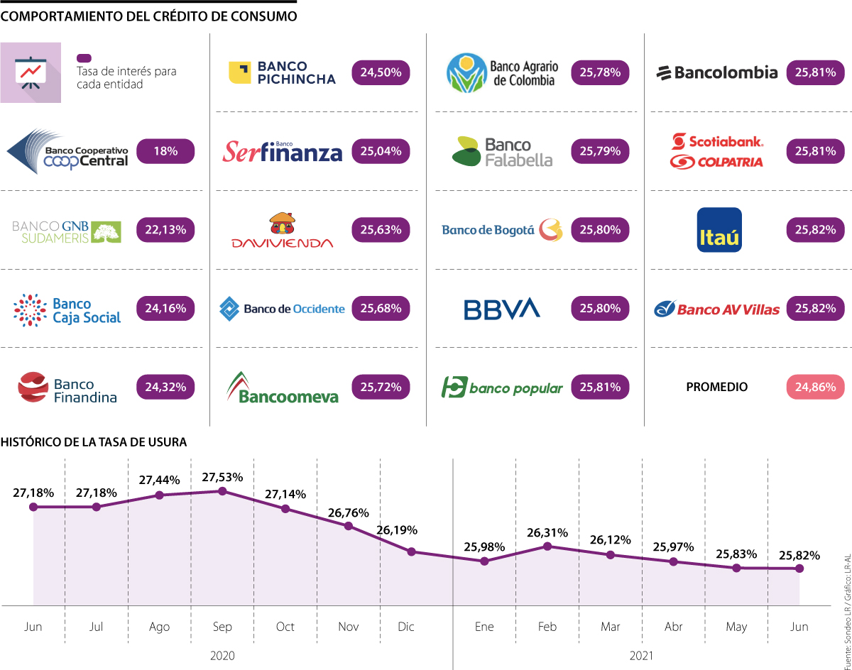 Las entidades financieras que más se acercan al indicador de usura para crédito de consumo son AV Villas e Itaú, ambas con una tasa de 25,82%; seguidas por Scotiabank Colpatria, Bancolombia y Banco Popular, con tasas de 25,82%; además de Bbva y Banco de Bogotá, con 25,80%.