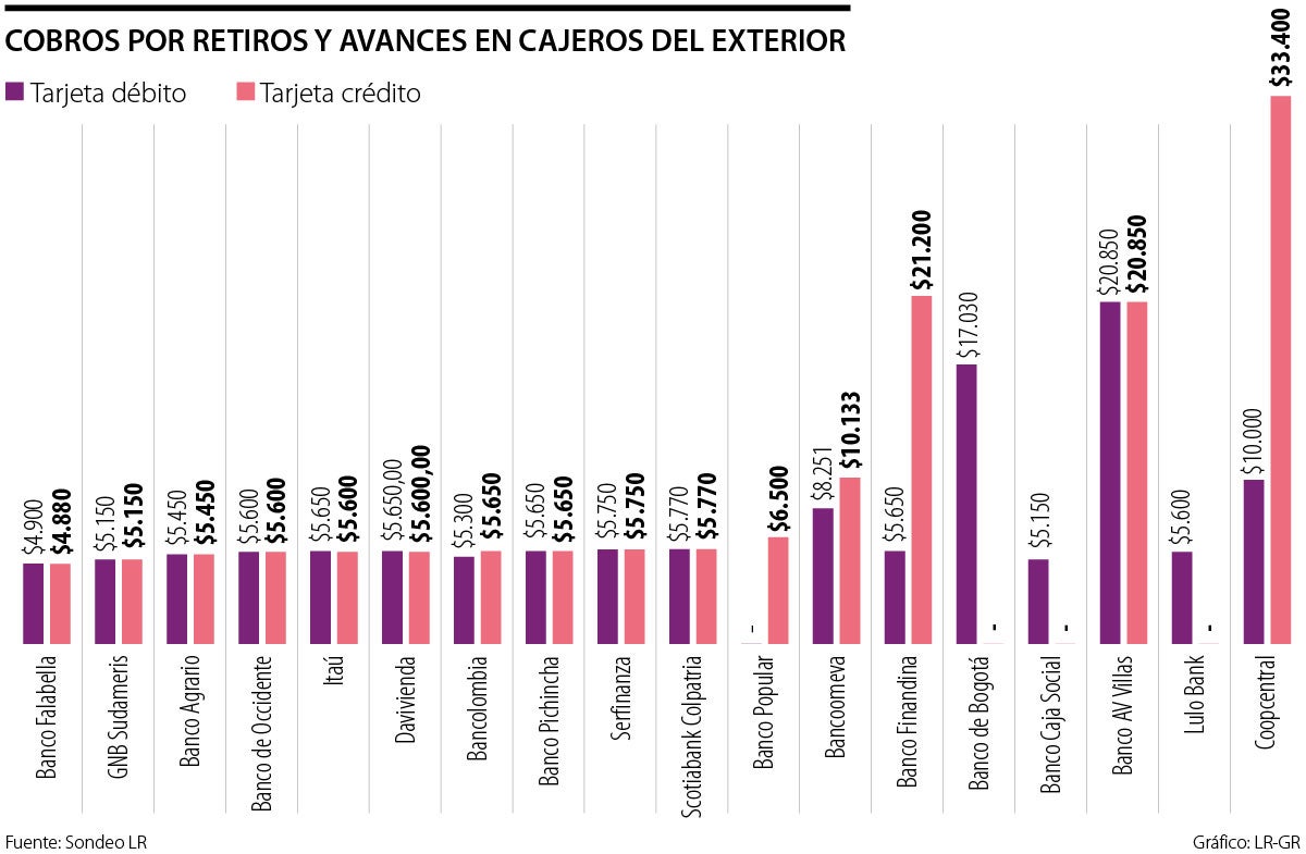 Si tiene pensado un viaje al extranjero, es clave tener en cuenta los costos en los que puede incurrir a la hora de retirar en efectivo. Un sondeo realizado por LR determinó que Banco Falabella, GNB Sudameris, Banco Agrario, Banco de Occidente e Itaú tienen las tarifas más económicas para avances con tarjeta de crédito en el exterior, con $4.880, $5.150, $5.450, $5.600 y $5.600, respectivamente.
