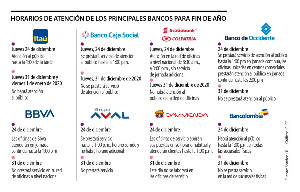 Por su parte, el Grupo Aval señaló que “el sábado 26 de diciembre y el sábado 2 de enero, prestarán servicio 50% de las oficinas tradicionales que abren sus puertas esos días, garantizando cobertura. También prestarán servicio 100% de las oficinas de Recaudos y Pagos que normalmente prestaban servicio en horario de sábado. Mientras que el 30 de diciembre, las oficinas prestarán servicio en horario normal sin horario adicional”.