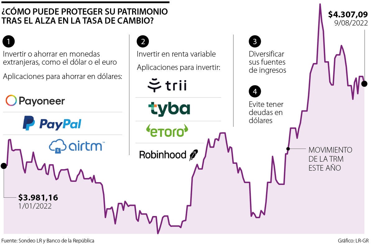 También se recomienda hacer inversiones que tengan exposición a la divisa estadounidense, como la renta variable. Para Andrés Moreno, analista financiero y bursátil, “lo primero es que siempre hay que diversificar las inversiones y el patrimonio, tener activos en otra moneda diferente. La devaluación trae oportunidades muy interesantes en el mercado de renta variable, entonces un consejo es comprar acciones, sobre todo aquellas que están listadas en Estados Unidos”. Algunas de las aplicaciones que puede utilizar para comprar títulos, tanto en la bolsa local como en la extranjera, son Trii, Tyba, eToro y Robinhood.