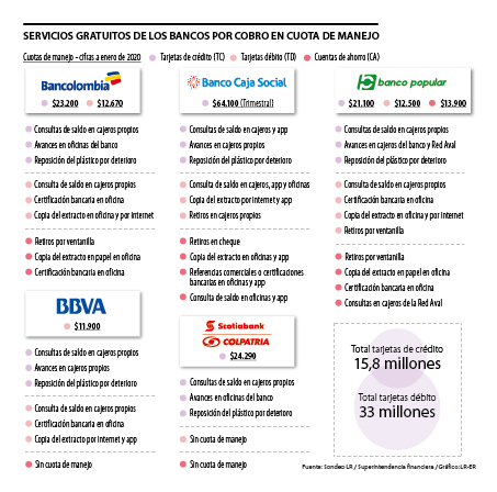 En principio, los servicios de consultas de saldo en cajeros y oficinas, los avances en estos mismos dos canales, los extractos bancarios, certificaciones, reposición de plásticos por deterioro y ciertos retiros son algunos de los que las entidades estipularon tras ser consultadas. Para el caso del Banco Popular, las consultas se facilitan para tarjetas débito en sus cajeros o los de la Red Aval.