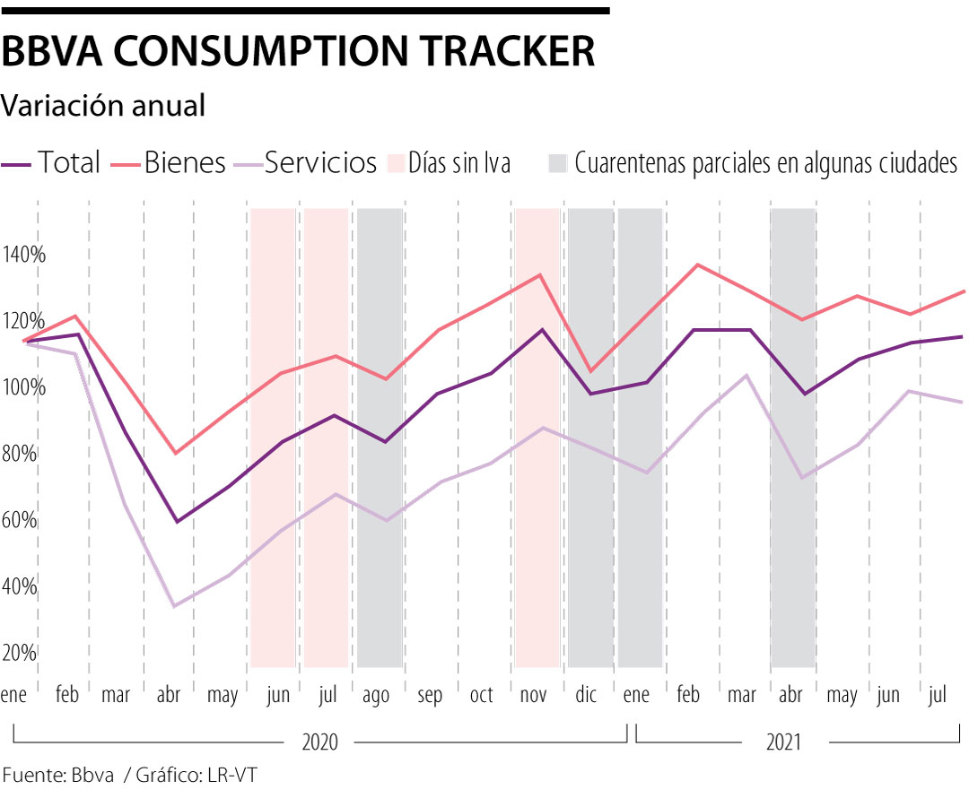 Bbva publicó el Consumption Tracker con corte al 2 de agosto. Este es un indicador de consumo que mide el número de transacciones con tarjetas débito y crédito de los clientes de la entidad y categoriza las compras por segmento y región.