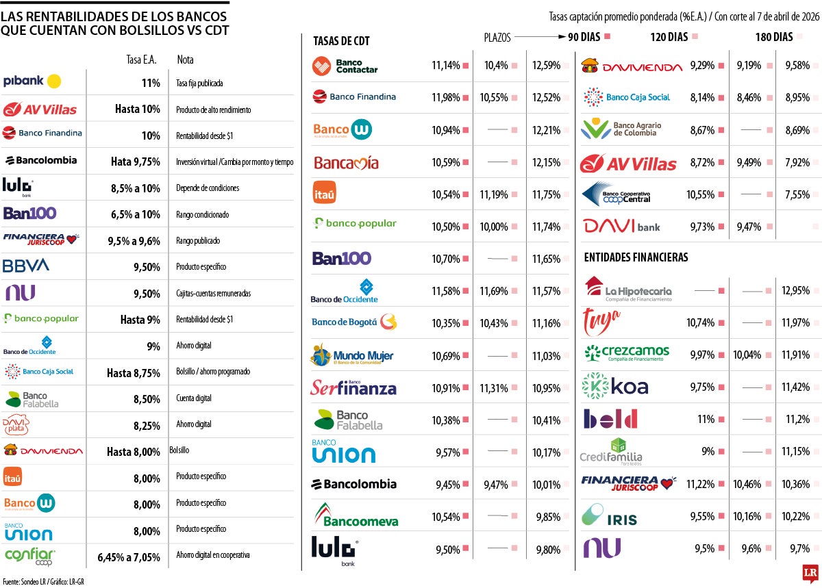 Este nivel de tasas comienza a equipararse con el de los CDT de corto plazo. Por ejemplo, en el segmento de 90 días, con cifras de la Superfinanciera con corte a 7 de abril de 2026, entidades como Finandina ofrecen tasas de 11,98%, Banco de Occidente con 11,58% y Banco Contactar con 11,14%. Para plazos de 120 días, las tasas se ubican en niveles cercanos a 11%.