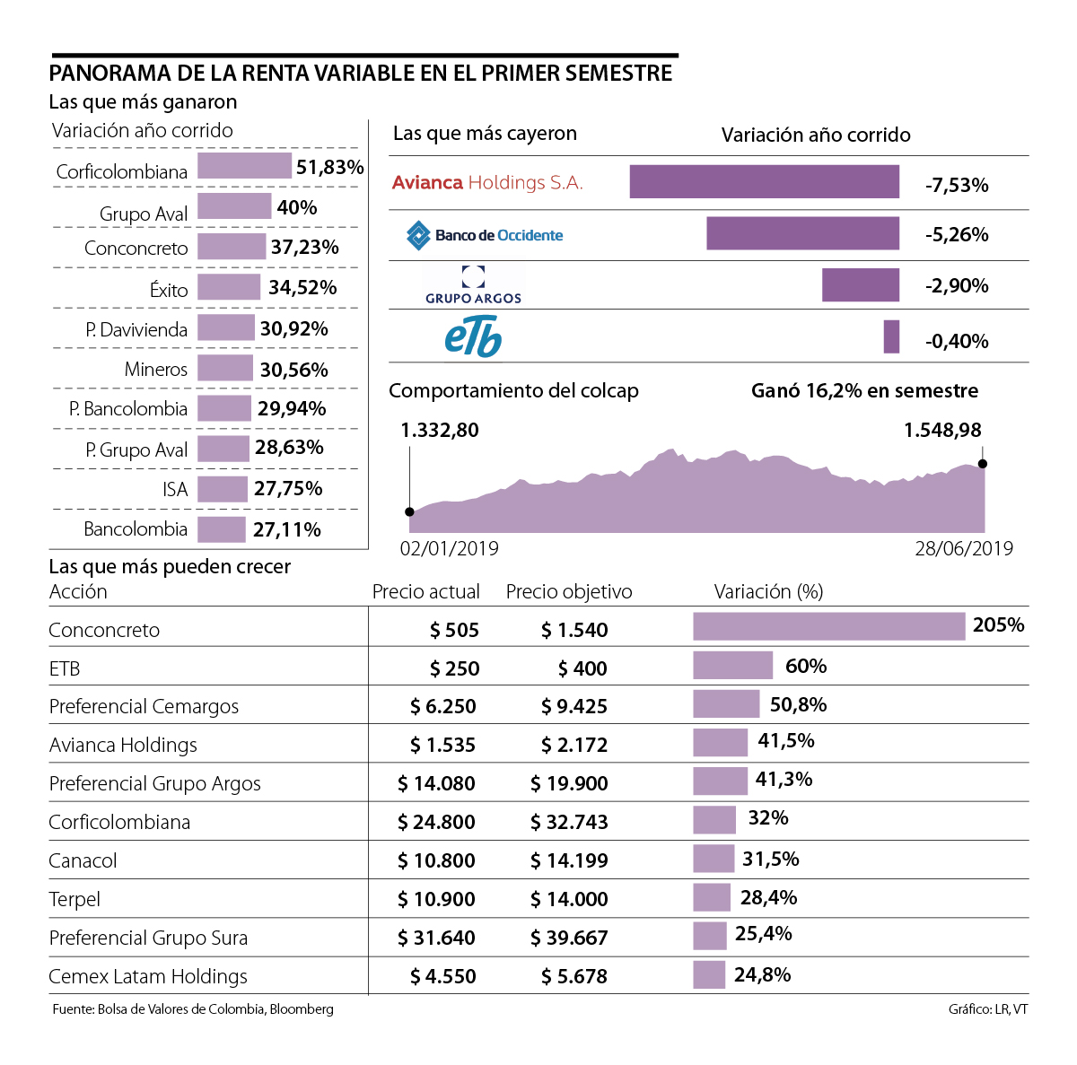 Las acciones Corficolombiana (51,8%), Grupo Aval (40%) Conconcreto (37,2%), Éxito (34,5%) y la Preferencial de Davivienda (30,92%) configuran el top 5 de las que vieron mayor parte de esta valorización, y fueron las propulsoras del Colcap en la primera parte del año.