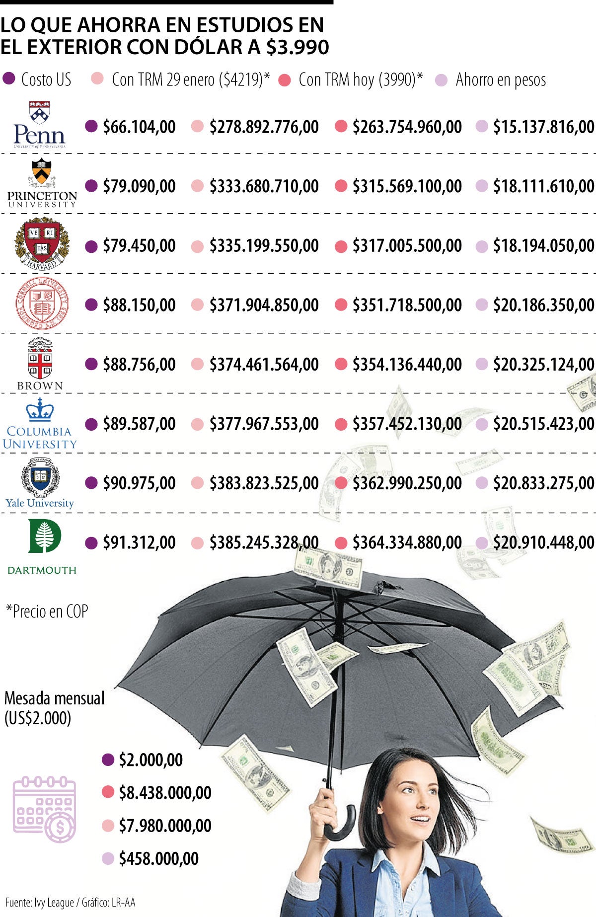 De acuerdo con las cifras, la Universidad de Pensilvania, la más asequible del grupo con un costo de US$66.104, equivalía a $278,8 millones con la TRM de enero. Hoy, ese mismo pago se sitúa en $263,8 millones, lo que supone un ahorro cercano a $15 millones. En el otro extremo, Dartmouth, con un valor de US$91.312 por curso, pasaría de $385 millones a $364,5 millones, con un ahorro de casi $21 millones por año académico.