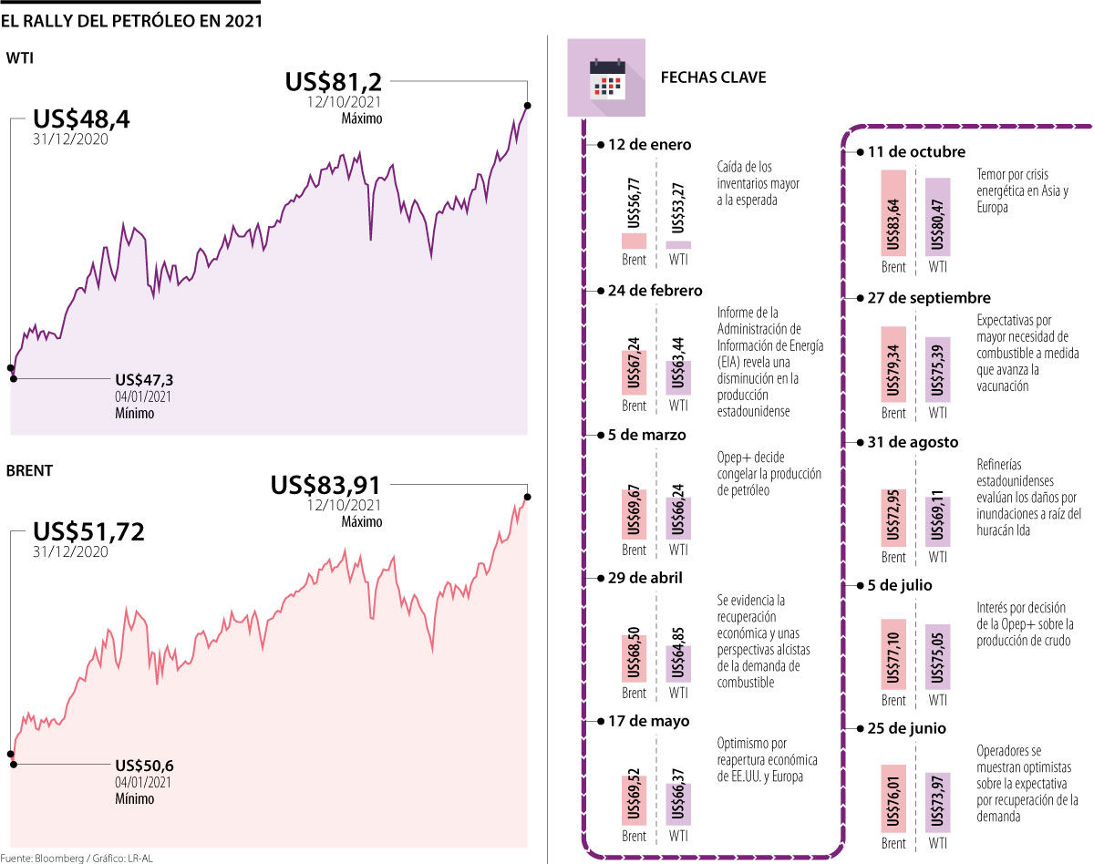 A esto se han sumado dos momentos cruciales dentro de la industria. El paso del huracán Ida por el Golfo de México fue uno de ellos, hecho que generó una caída en la producción estadounidense de 200.000 barriles por día (bpd), según cifras de la Administración de Información de Energía (EIA). La segunda razón es la crisis energética por la que atraviesa el sector, especialmente en Asia y Europa.