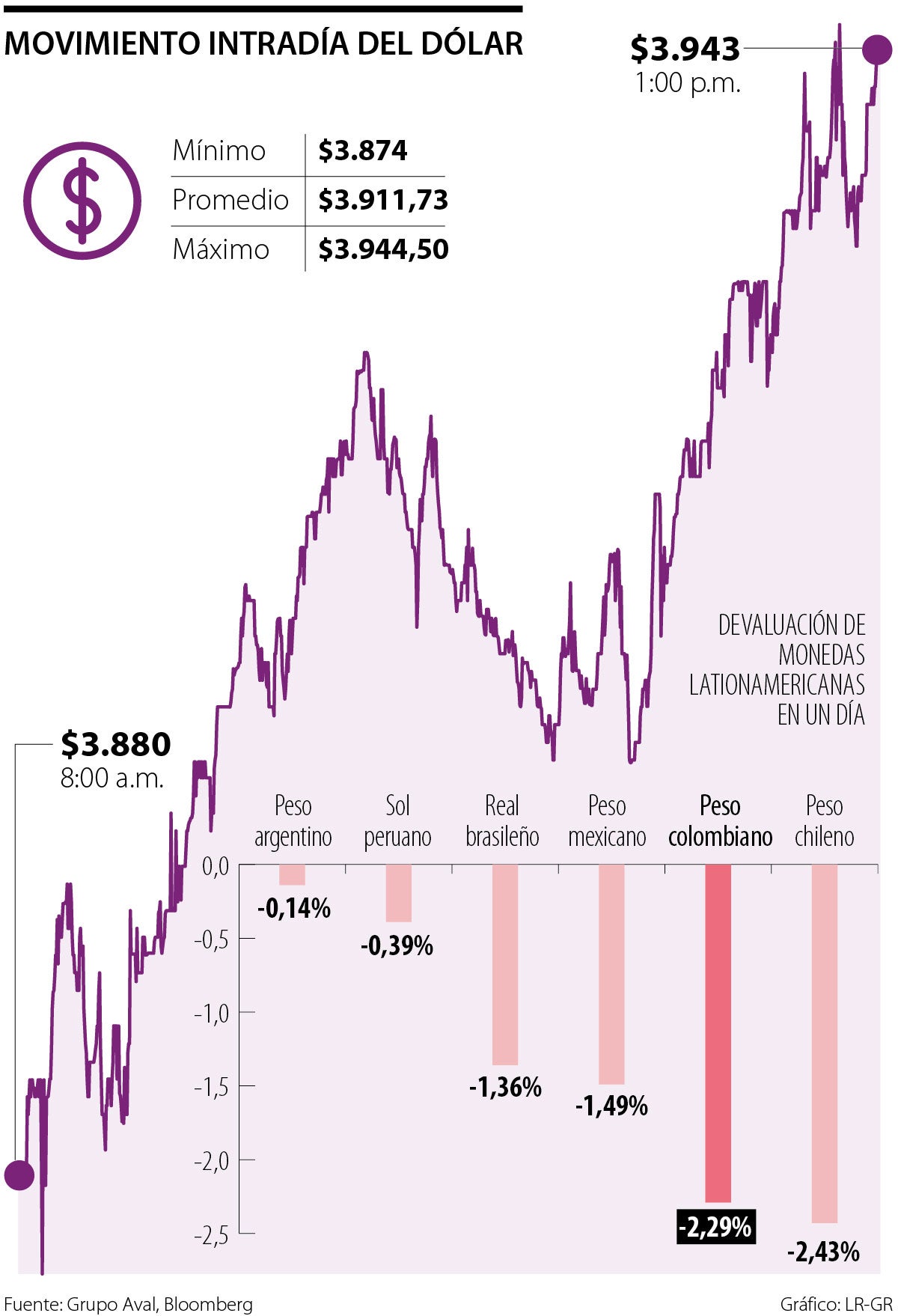 Según datos publicados por Bloomberg, el peso chileno y el colombiano fueron los más revaluados en la jornada dentro de las divisas latinoamericanas, con caídas de 2,43% y 2,29%, respectivamente.