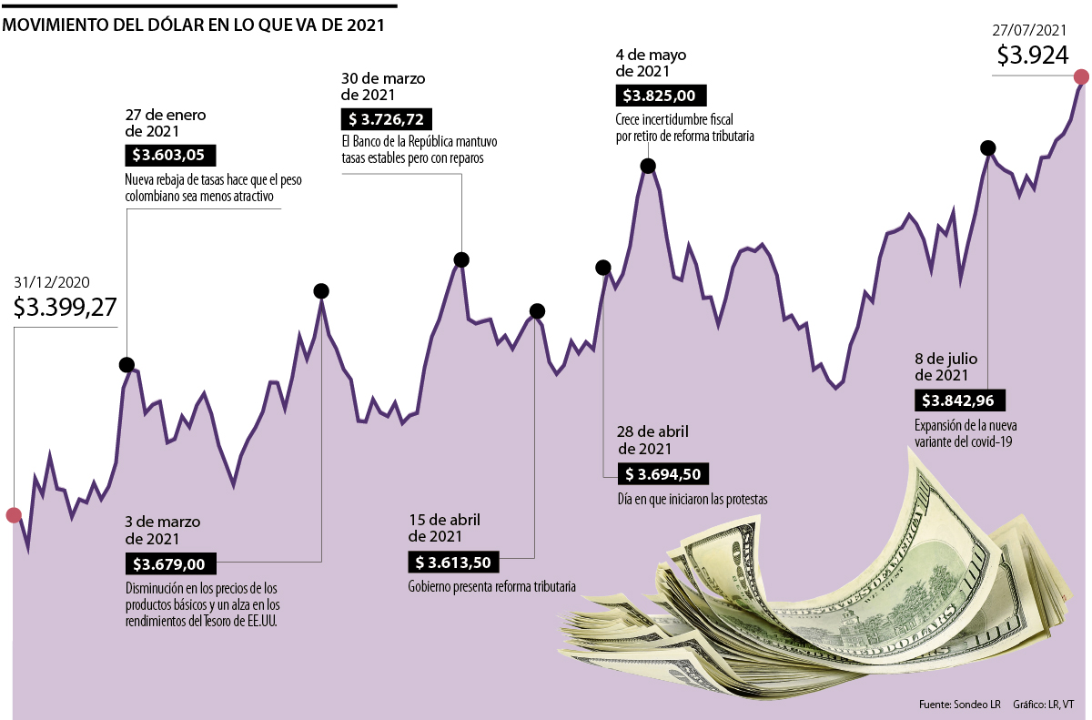Desde inicios de 2020, la divisa ha ganado $691,28 frente al peso y durante los últimos 12 meses ha ascendido $227,62. Tan solo en lo que va de julio ha subido $169,92.