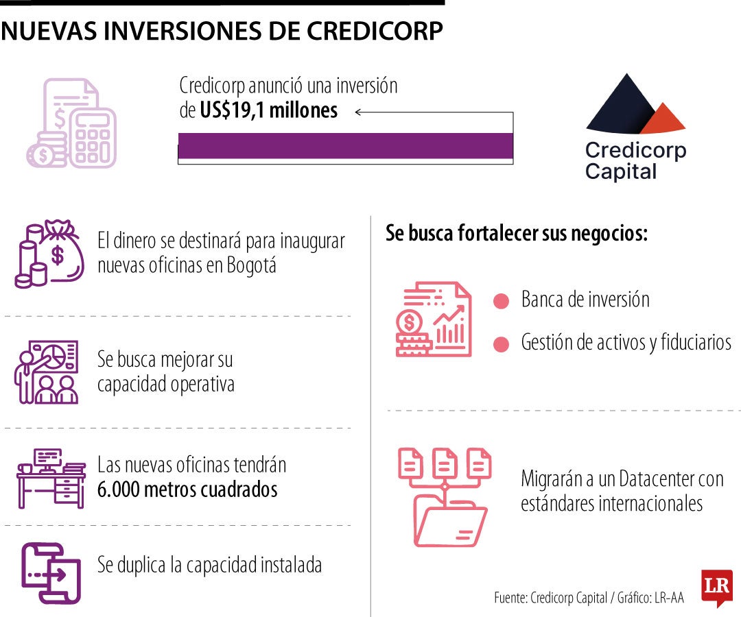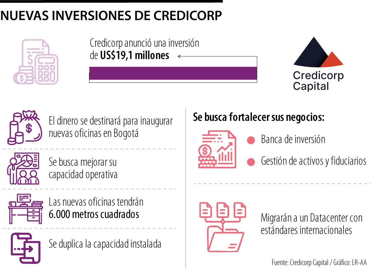 Credicorp Capital anunció una inversión por más de US$19 millones para fortalecer su negocio en Colombia. La entidad aseguró que el dinero se destinará para la inauguración de sus nuevas oficinas en Bogotá. Se busca un avance hacia modelos más modernos, digitales y competitivos.