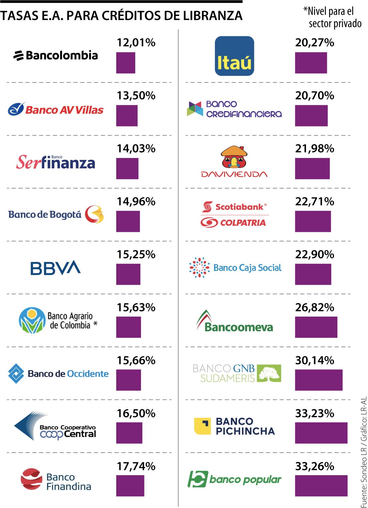 Aquellos bancos con los niveles más bajos son Bancolombia, con 12,01%; AV Villas, con 13,50%; Serfinanza, con 14,03%; Banco de Bogotá, con 14,96%; y Bbva, con 15,25%. Sin embargo, cada entidad tiene términos y condiciones que deberá revisar, ya que las tasas pueden cambiar si se trata de un trabajador o de un pensionado. Igualmente, se pueden modificar si son variables o fijas; o si su destino será la compra de cartera.