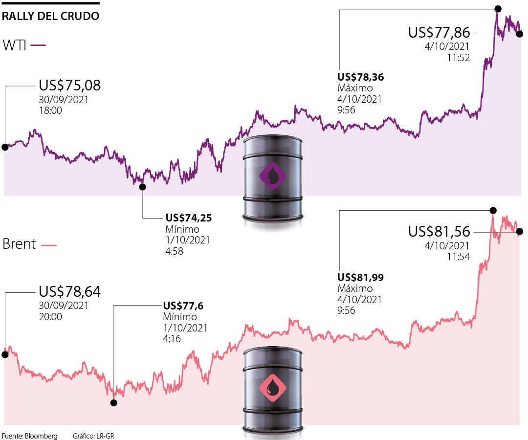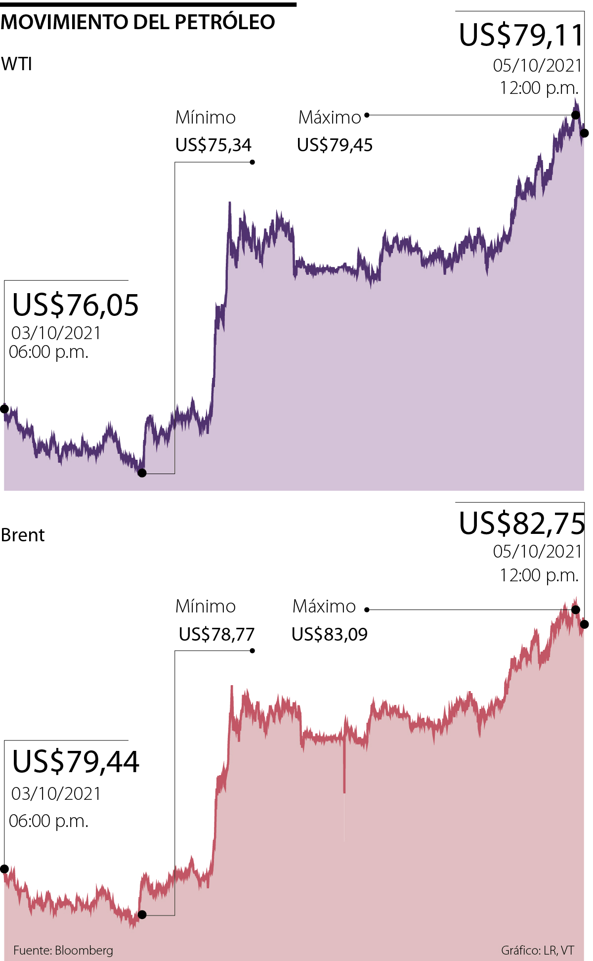 Los precios del petróleo han regresado a niveles de 2018 y recorren un camino alcista que podría terminar cerca de niveles de hace siete años, cuando se cotizaba sobre US$100 por barril. El crudo estadounidense, West Texas Intermediate (WTI), subió 1,70% a US$79,11 el barril, mientras que la referencia europea, Brent, aumentó 1,60% a US$82,75.