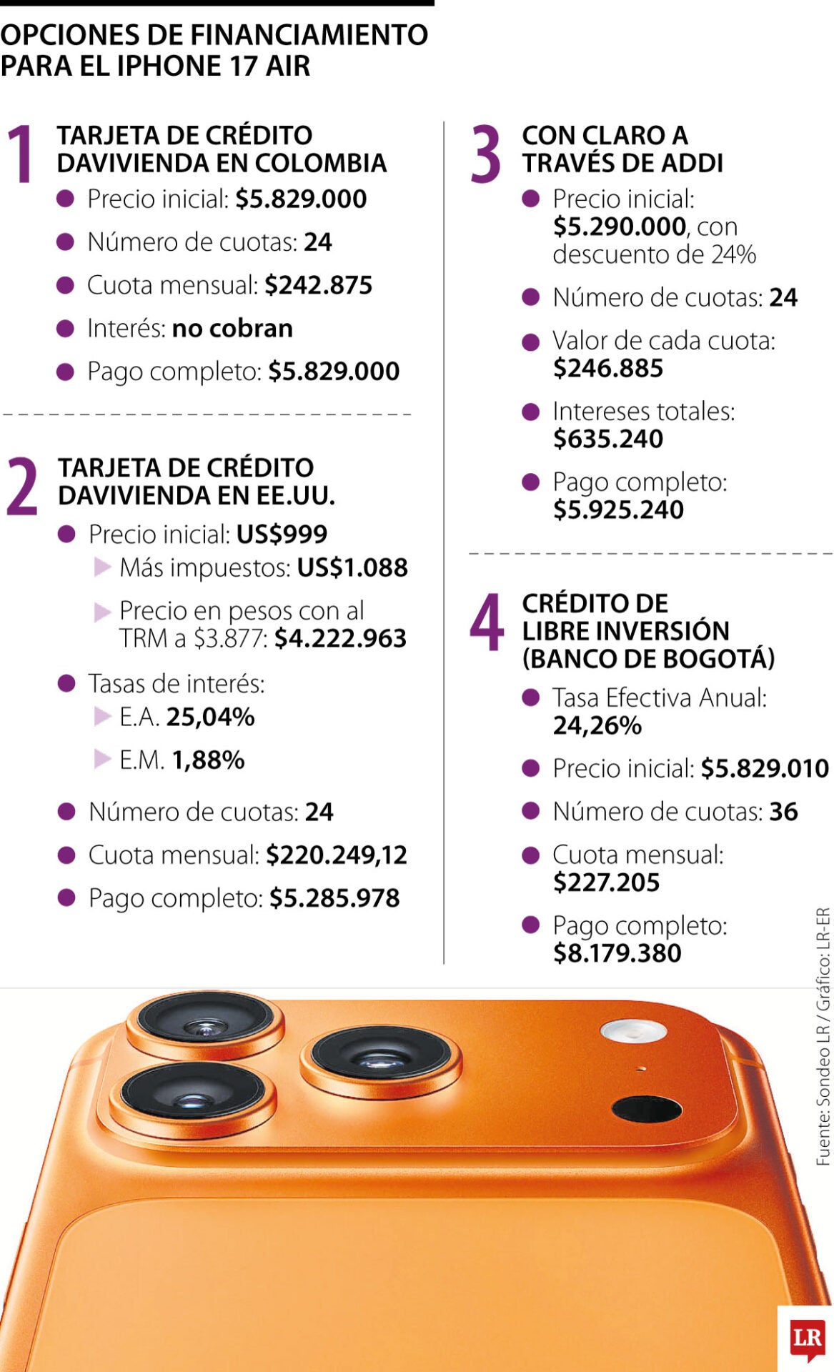 El mismo plástico ofertado por Davivienda sirve para comprar el iPhone 17 Air directamente en Estados Unidos. Es importante tener en cuenta que el precio inicial en el país americano es de US$999; si se le suman los impuestos, el precio es de US$1.088. Este valor en pesos colombianos con la TRM a $3.877 quedaría en $4,22 millones. En este caso sí aplican las tasas de interés para la tarjeta, las cuales están representadas en 25,04% Efectivo Anual, E.A, o 1,88% Efectivo Mensual, E.M.