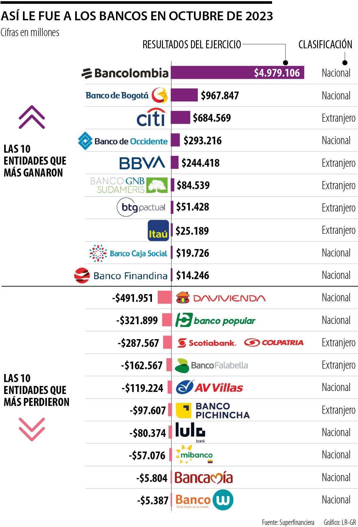 Por entidad bancaria, los cinco bancos con las mayores utilidades fueron: Bancolombia, con $4,97 billones; Banco de Bogotá, con $967.847 millones; Citibank, con $684.569 millones; Banco de Occidente, con $293.216 millones; y Bbva Colombia, con $244.418 millones.