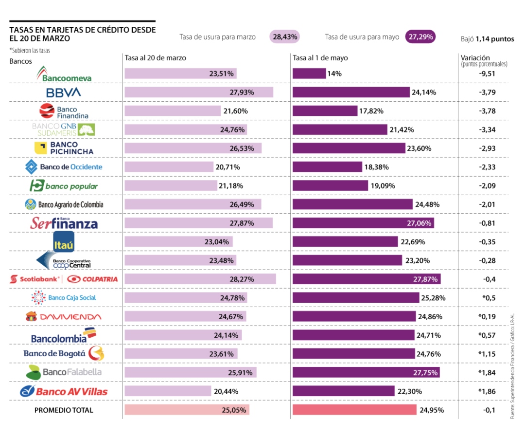 La entidad que más rebajó su tasa de interés es el Banco Coomeva, que pasó de un índice de 23,51% el 20 de marzo a 14% a comienzos de mayo, con una disminución de 9,51 pps.