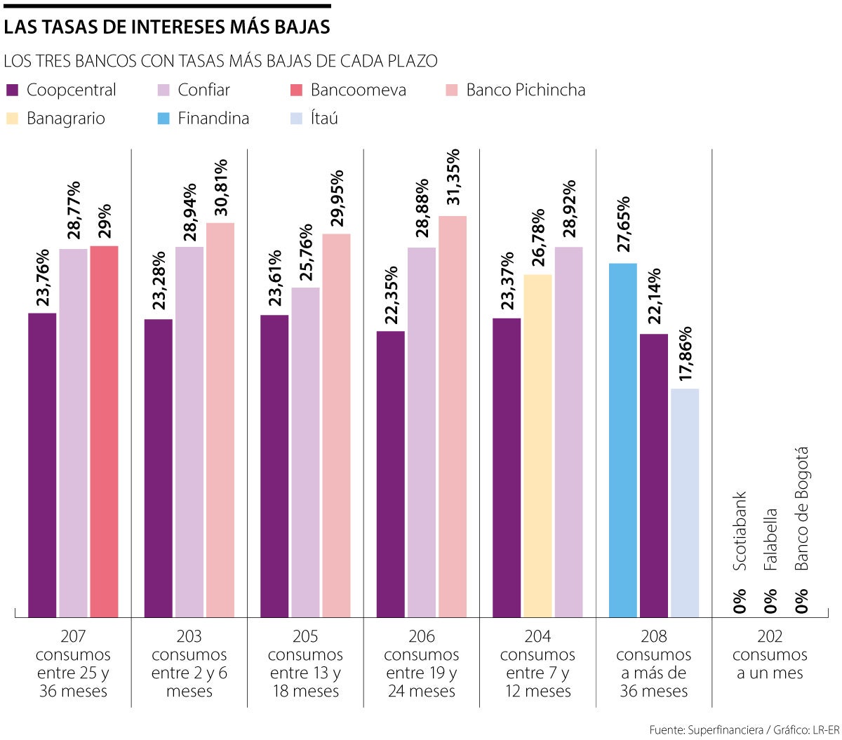 Según la Superfinanciera, Itaú (17,86%), Coopcentral (22,14%) y Finandina (27,65%) cuentan con las tasas más bajas en la categoría de 208 consumos a más de 36 meses, le siguen bancos como Av Villas, con 28,23%, y Juriscoop C.F., con 29,86%. Scotiabank Colpatria, Juriscoop C.F., Banco Falabella, Banco Bogotá y Av Villas, para el plazo de 202 consumos a un mes, tienen tasas de 0%.