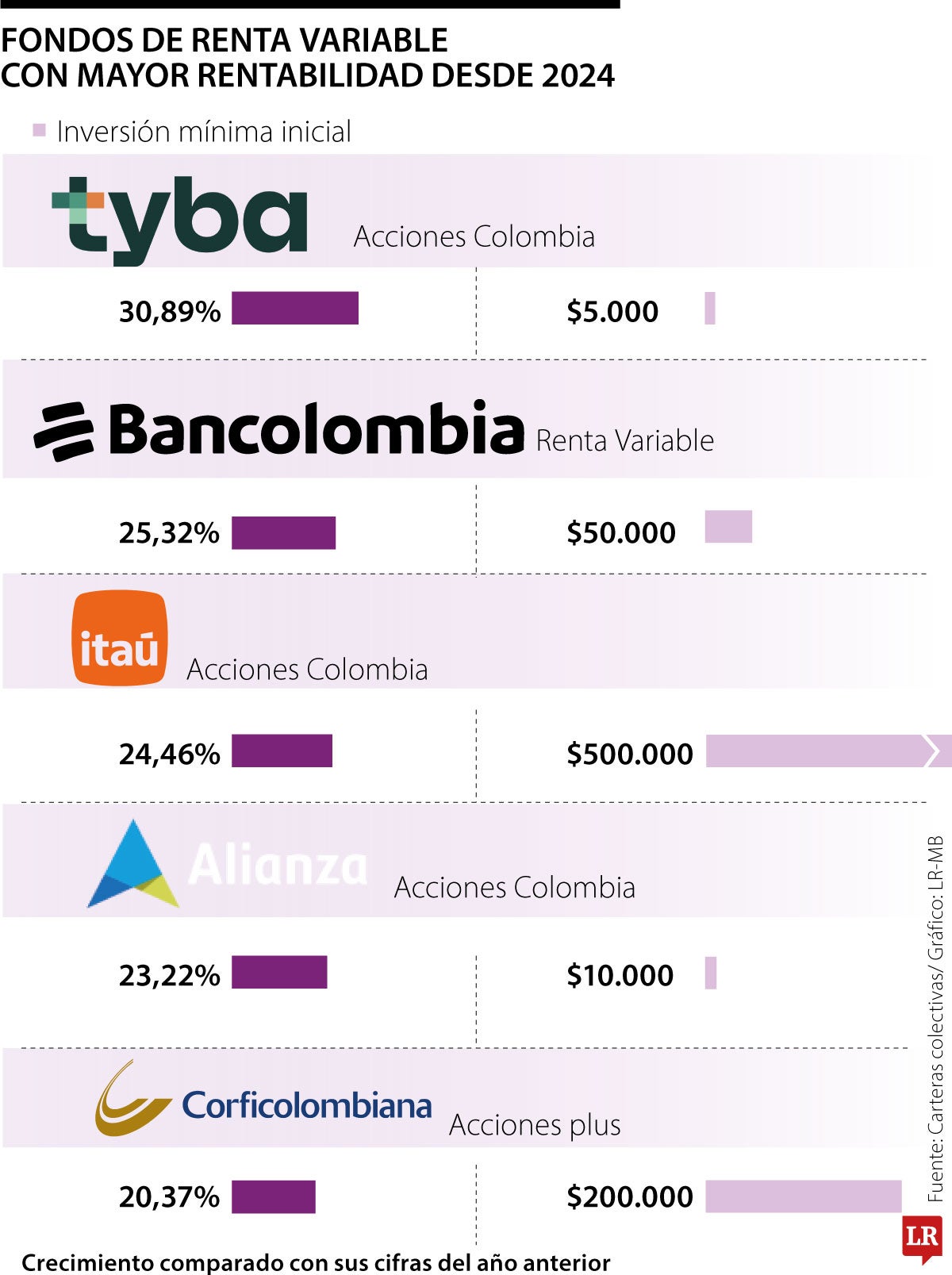 Los siguientes fondos de renta variable tienen un índice de riesgo alto, pero son los de mayor rendimiento actualmente: Tyba - Acciones Colombia con 30,89%, Bancolombia Renta Variable con 25,32%, Itaú Acciones Colombia con 24,46%, Alianza Acciones Colombia 24,46% y Corficolombiana Acciones Plus con 20,37%.