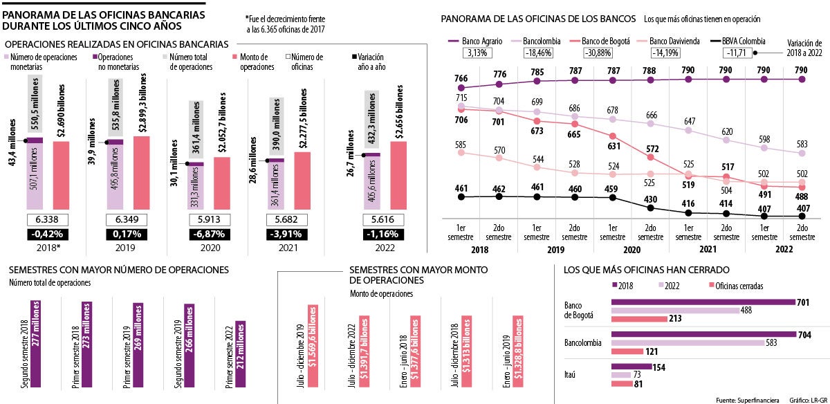 Y es que, justamente, en cinco años, según la recopilación de los informes de operaciones financieras de la Superintendencia Financiera de Colombia, han pasado de haber 6.338 oficinas en 2018 a 5.616 en 2022, es decir, el año pasado había 11,39% o 722 menos que hace cinco años.