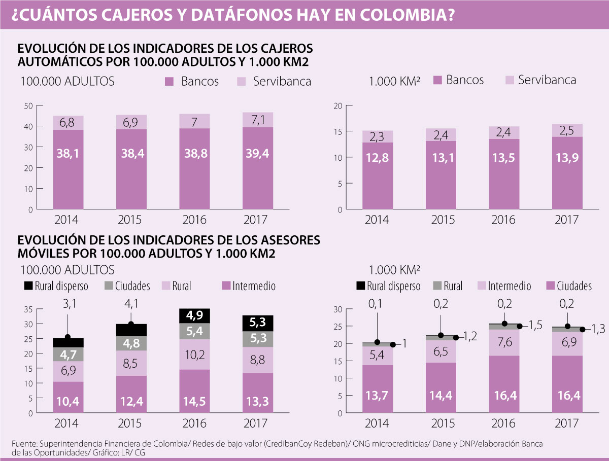 En Colombia existen más de 15.700 puntos de este tipo distribuidos por todo el país, 13.300 (84,7% del total) pertenecientes a alguna entidad bancaria, y casi 2.400 (15,3%) más de la red Servibanca, de acuerdo con cifras de la Superintendencia Financiera de Colombia, el Departamento Administrativo Nacional de Estadística (Dane) y el Departamento Nacional de Planeación (DNP), recopiladas por la Banca de las Oportunidades.