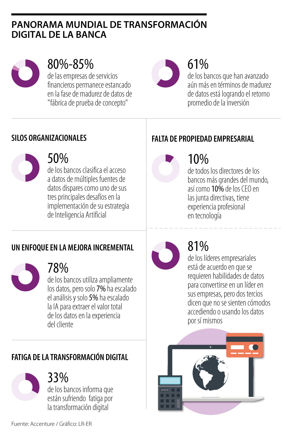 La banca sigue su transformación digital, pero muchas entidades se quedan estancadas. Entre 80% y 85% de las empresas de servicios financieros permanece en la fase de madurez de datos y 33% de los bancos informó que están sufriendo fatiga por la transformación digital.