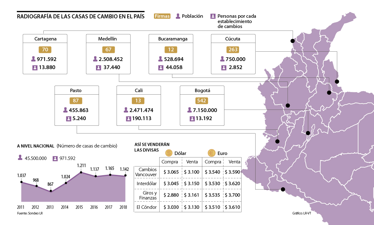 Estos datos surgen de la consulta a cada una de las Cámaras de Comercio de las ciudades principales como Bogotá, Medellín, Cali, Cartagena, Cúcuta, Pasto, y Bucaramanga. La información corresponde al número de firmas que están registradas comercialmente como aquellas que se dedican a actividades de las casas de cambio y/o actividades de los profesionales de compra y venta de divisas, según su código.