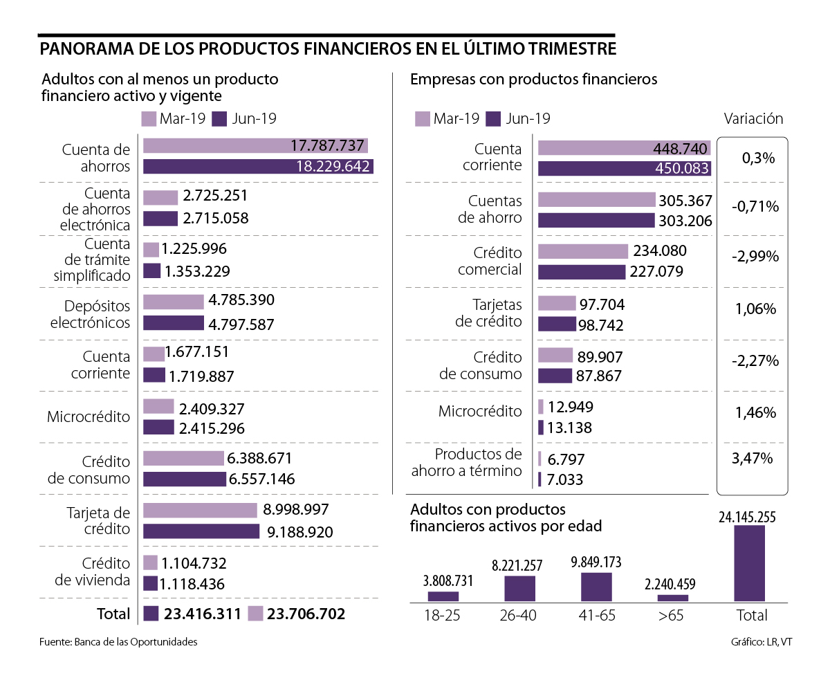 A junio de este año, en esta herramienta se reportaron más de 18 millones de adultos, seguidos por estas mismas cuentas pero electrónicas, con 2,7 millones y cuentas de trámite simplificado con más de 1,3 millones de personas. En este punto las de mayor variación fueron las cuentas de trámite simple (10,38%), crédito de consumo (2,64%) y las cuentas corriente, con un crecimiento de 2,55%.