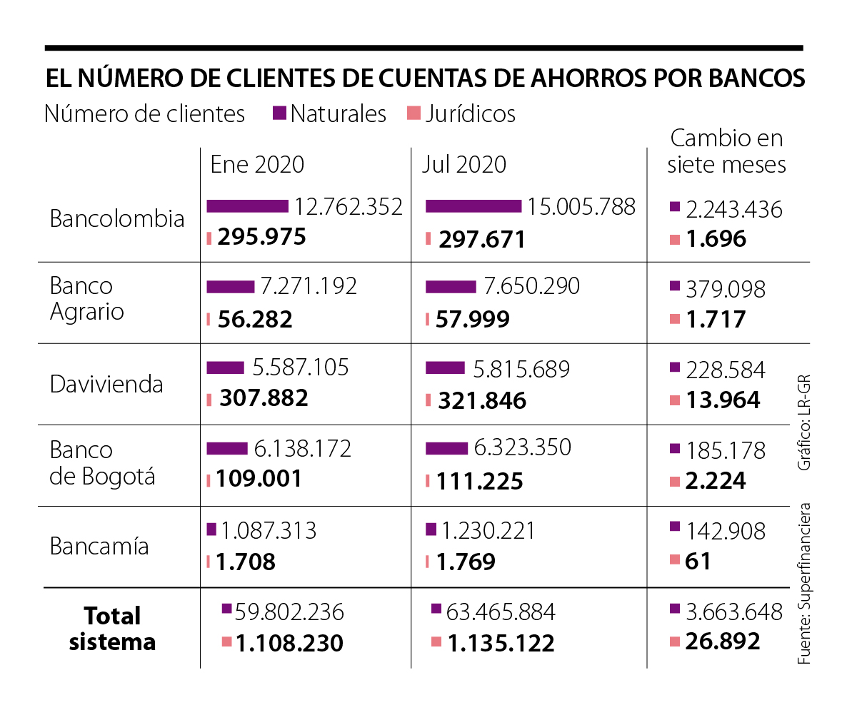En medio de la crisis desatada por la pandemia, el sistema financiero sumó 3,69 millones de clientes nuevos en materia de cuentas de ahorro, ya que este producto pasó de tener 60,9 millones de usuarios en enero de 2020 a 64,6 millones al cierre de julio de este año.